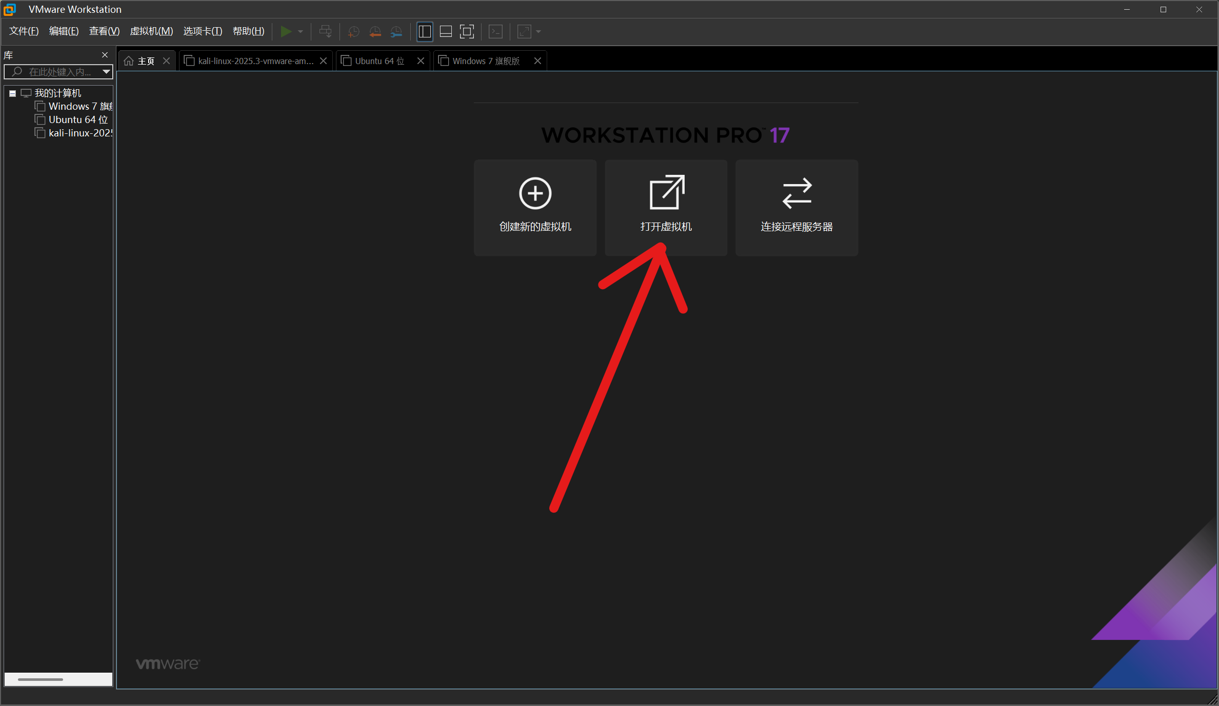 然后打开VMware Workstation Pro点击主页上的【打开虚拟机】