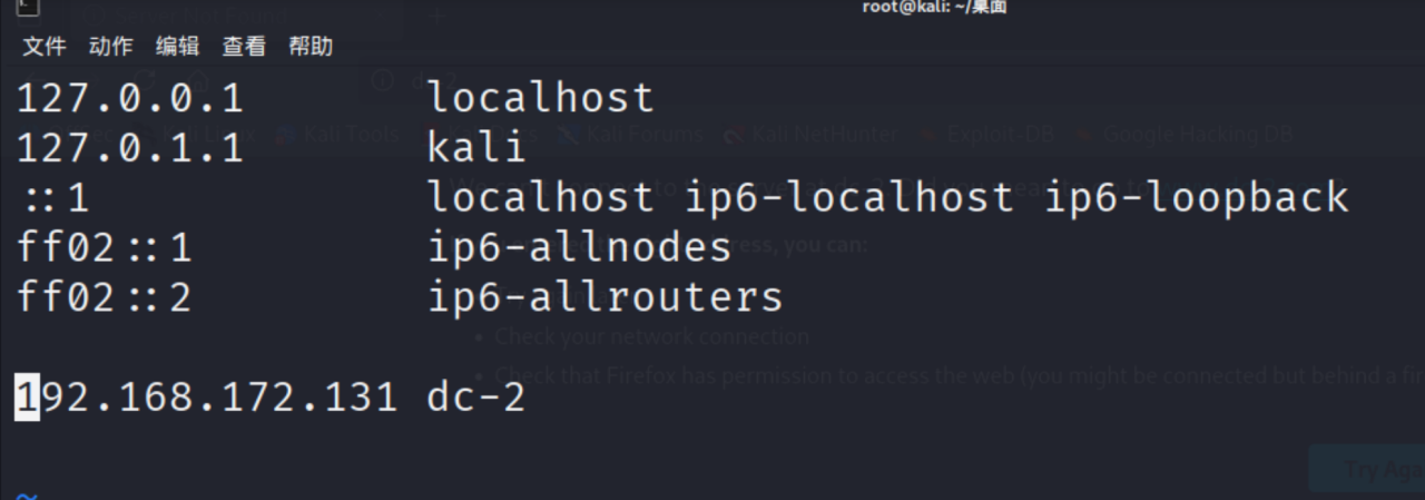 但是直接访问因为对方配置的域名是dc-2(并不是常规域名所以会解析失败),所以接下来要修改hosts文件: