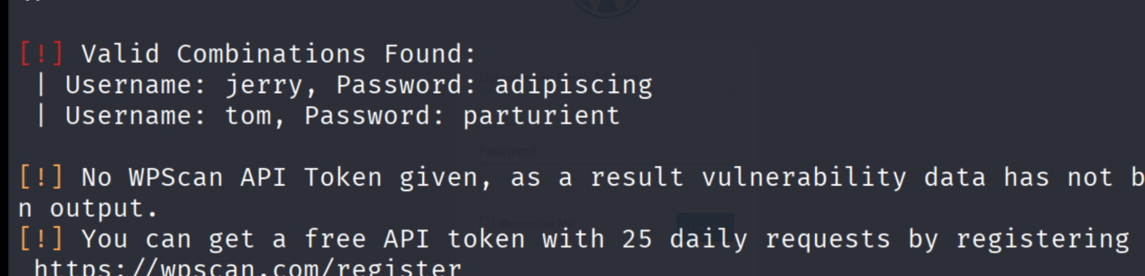 准备好用户名和密码字典后,使用wpscan进行爆破:
