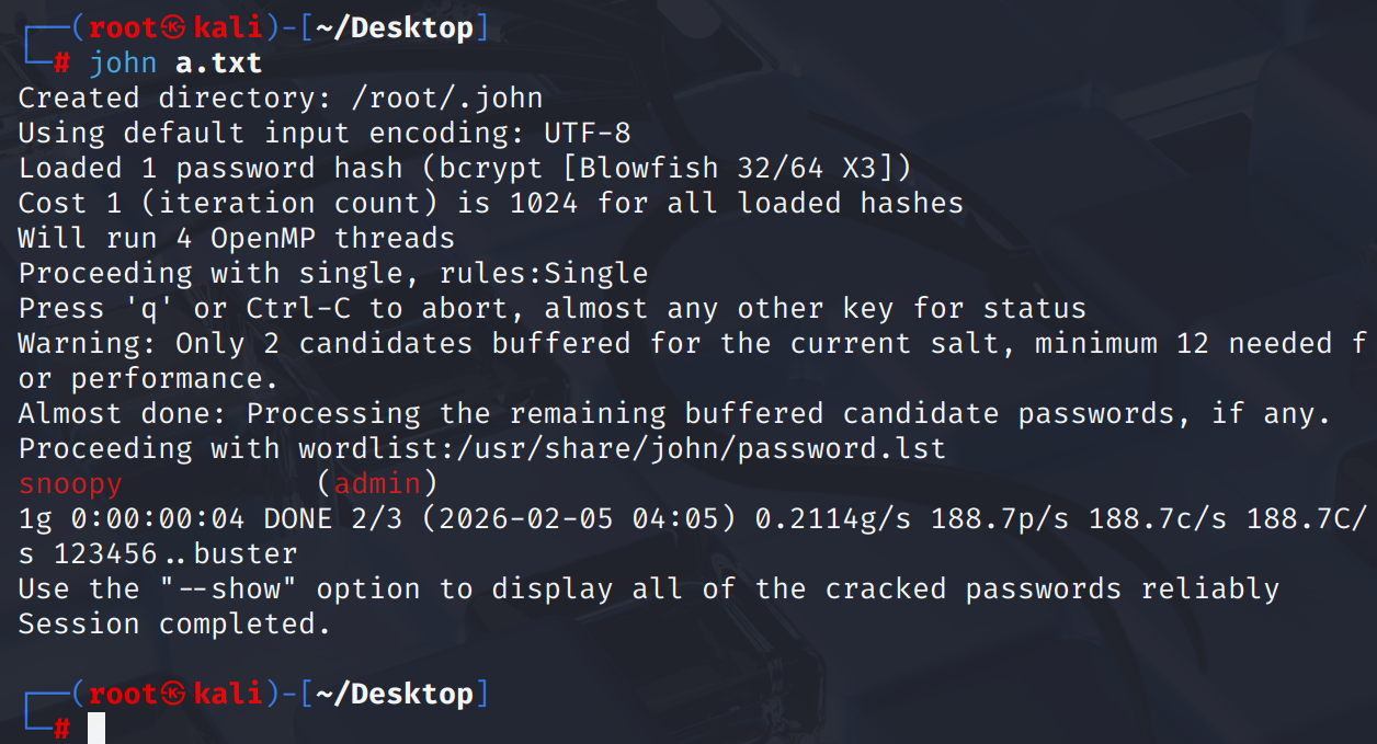 创建a.txt内容为:admin:$2y$10$DpfpYjADpejngxNh9GnmCeyIHCWpL97CVRnGeZsVJwR0kWFlfB1Zu
