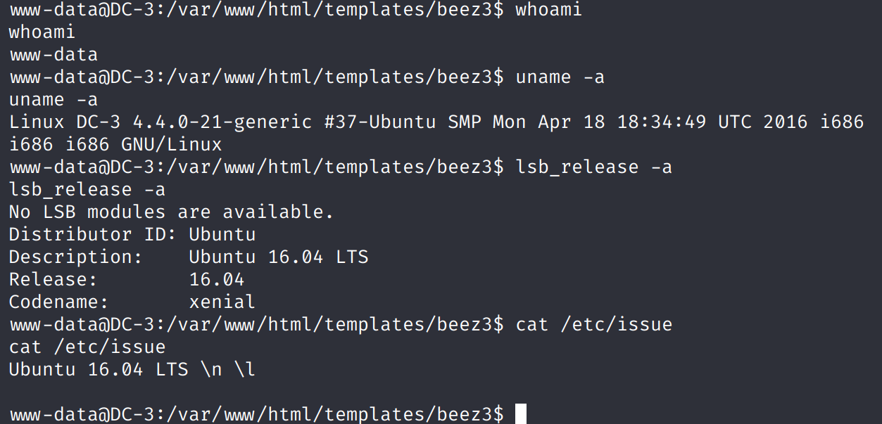 但是很多命令(如whoami、cat)都不能执行,因为是rbash(受限制的终端)