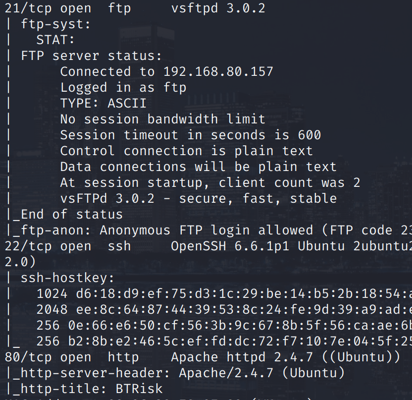 看到打开了 21(ftp)、22(ssh)、80(http) 三个端口。