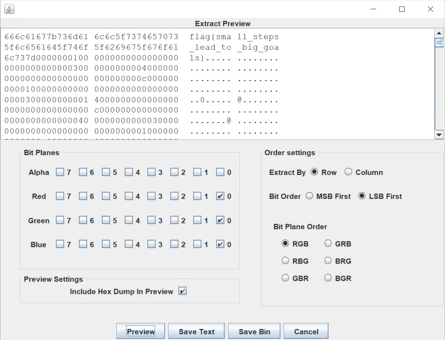 使用StegSolve打开,选择Analyse-DataExtract,按如下图勾选,点击Preview即可在开头看到flag