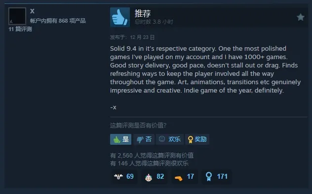 在所属品类中拿下 9.4 分的扎实成绩!这是我游戏库(已收藏 1000 多款游戏)里制作最精良的作品之一 —— 叙事呈现出色,节奏把控得当,全程没有拖沓或卡壳的问题。游戏用各种新颖设计让玩家全程保持沉浸感,美术、动画、转场等细节着实令人惊艳,创意拉满。绝对称得上年度最佳独立游戏!