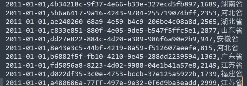 - 一月份数据是普通文本,使用逗号分割数据记录,从前到后分别是:日期,订单id,销售额,销售省份