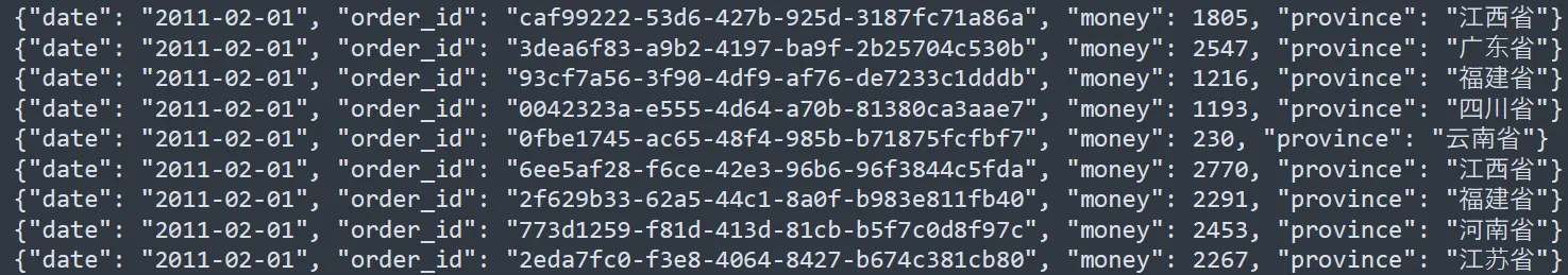 - 二月份数据是JSON数据,同样包含(日期,订单id,销售额,销售省份)